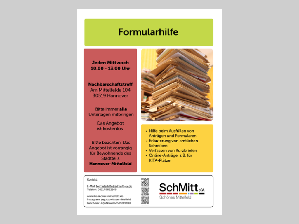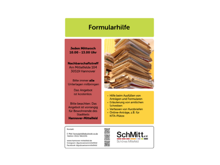 Hilfe Beim Ausfüllen Von Anträgen Und Formularen Erläuterung Von Amtlichen Schreiben Verfassen Von Kurzbriefen Online-Anträge, Z.B. Für KITA-Plätze Das Angebot Ist Kostenlos. Bitte immer alle Unterlagen mitbringen Bitte beachten: Das Angebot ist vorrangig für Bewohnende des Stadtteils Hannover-Mittelfeld Eine Anmeldun , ...Deutschkurs für Anfänger10:00 - 11:30