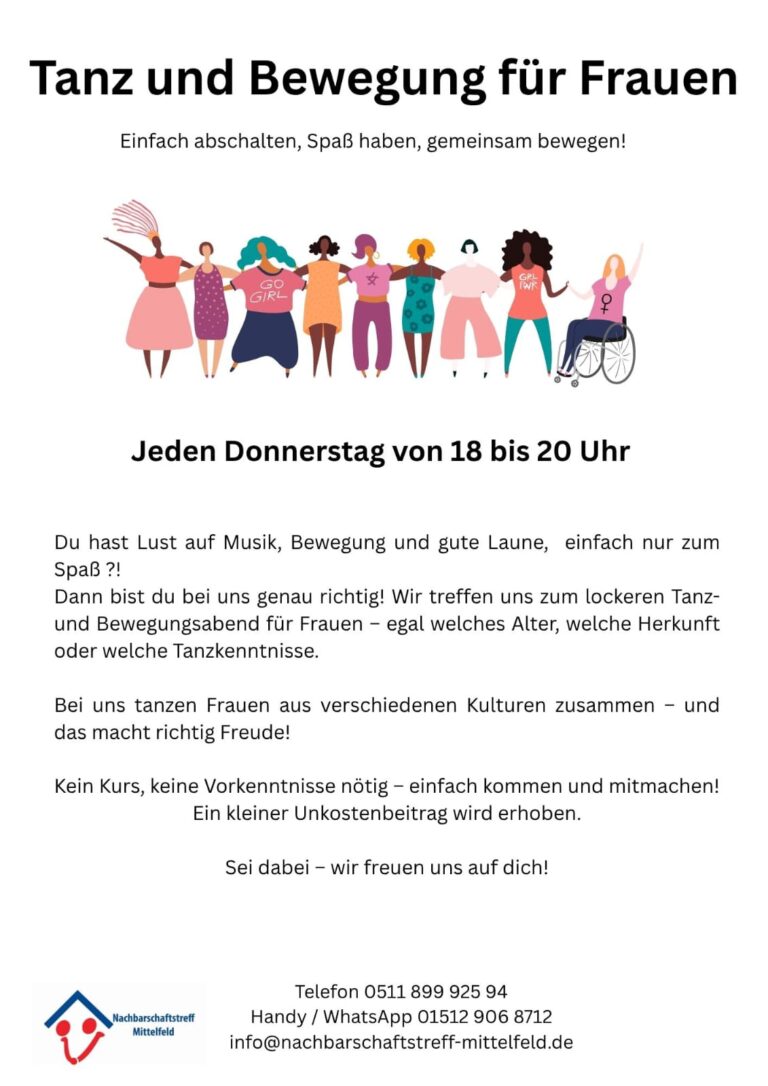 Tanz und Bewegung für Frauen Einfach abschalten, Spaß haben, gemeinsam bewegen! jeden Donnerstag 18.00 – 20.00 Uhr Du hast Lust auf Musik, Bewegung und gute Laune, einfach nur zum Spaß?! Dann bist Du bei uns genau richtig! Wir treffen uns zum lockeren Tanz und Bewegungsabend für Frauen – egal welches Alter , ... - 20
