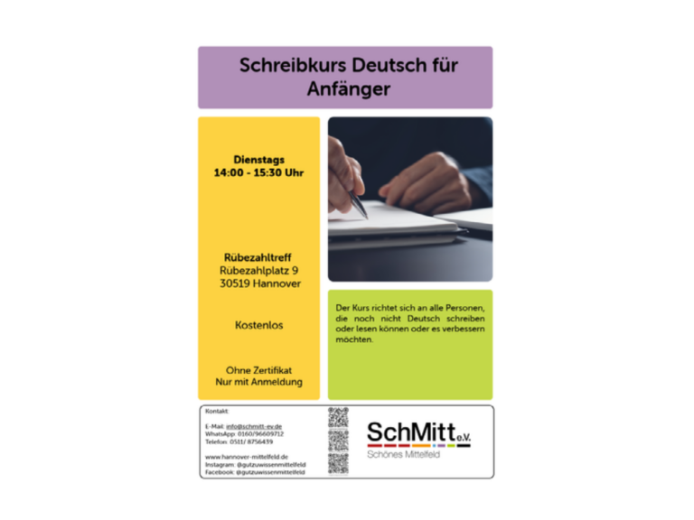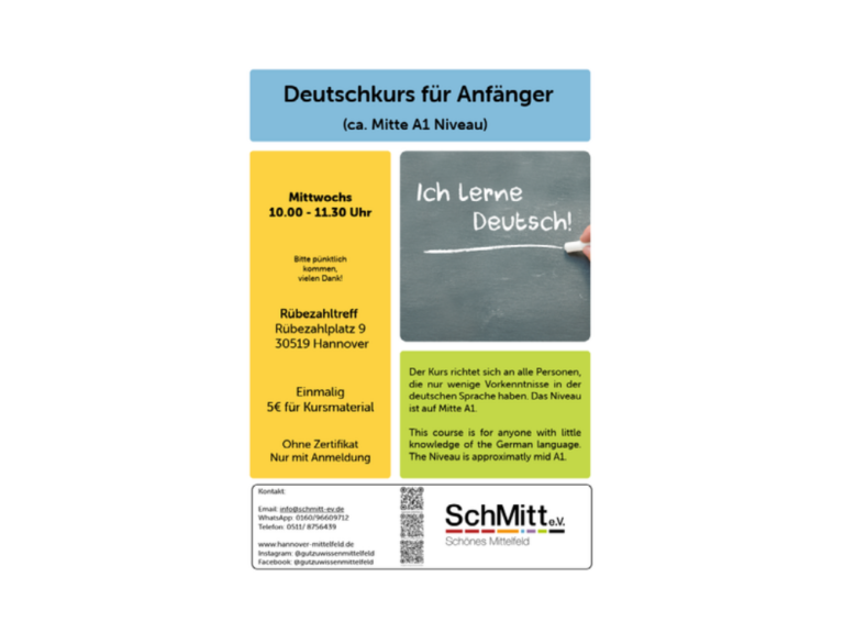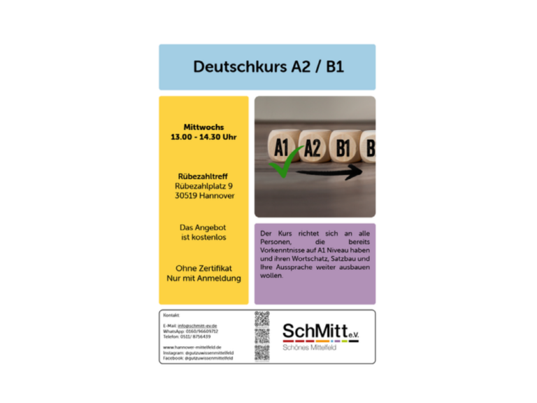 Der Kurs richtet sich an alle Personen, die noch keine oder sehr wenige Vorkenntnisse In der deutschen Sprache haben. (Bitte pünktlich kommen.) Bitte beachten: Ohne Zertifikat! Nur mit Anmeldung Anmeldung: E-Mail: Info@Schmitt-Ev.de WhatsApp: 0160/96609712 Telefon: 0511/ 8756439 Ei , ...Deutschkurs A2/B113:00 - 14:30