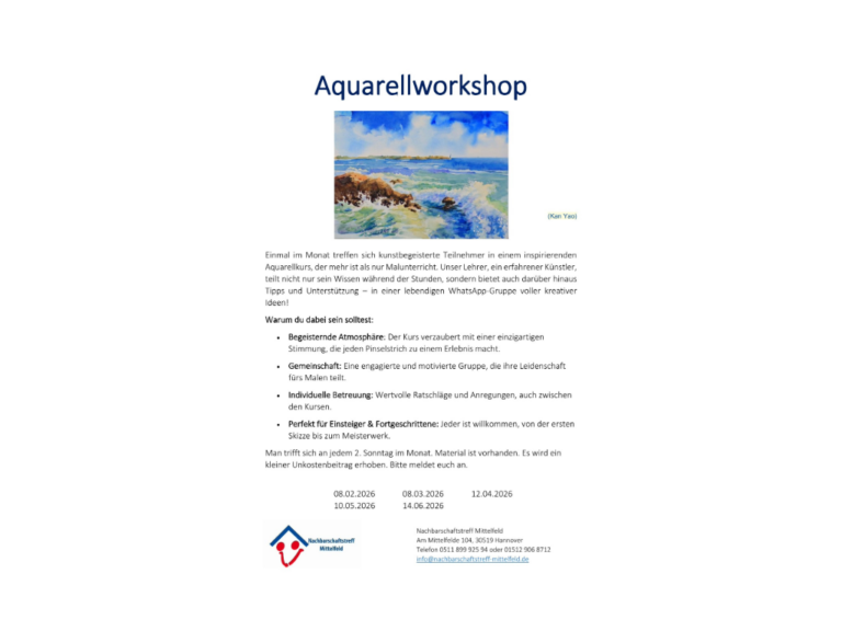 Einmal im Monat treffen sich kunstbegeisterte in einem inspirierenden Aquarellkurs, der mehr ist als nur Malunterricht. Unser Lehrer, ein erfahrender Künstler, teilt nicht nur sein Wissen während der Stunden, sondern bietet darüber hinaus Tipps und Unterstützung – in einer lebendigen WhatsApp Gruppe voller kreativer I , ...
