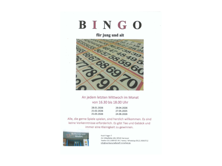 Du hast Lust auf Sport? Du hast eine Idee für ein kleines Projekt? Du Möchtest mit anderen Quatschen, Malen, Basteln, Kekse Backen, …? Es gibt bei uns keine feste Gruppe. Du kannst einfach vorbeikommen. Sag Deinen Eltern Bescheid, wohin Du gehst. Dies ist ein Angebot der Gnadenkirche und SchMitt e.V. mit freundlicher , ...Bingo16:30 - 18:00