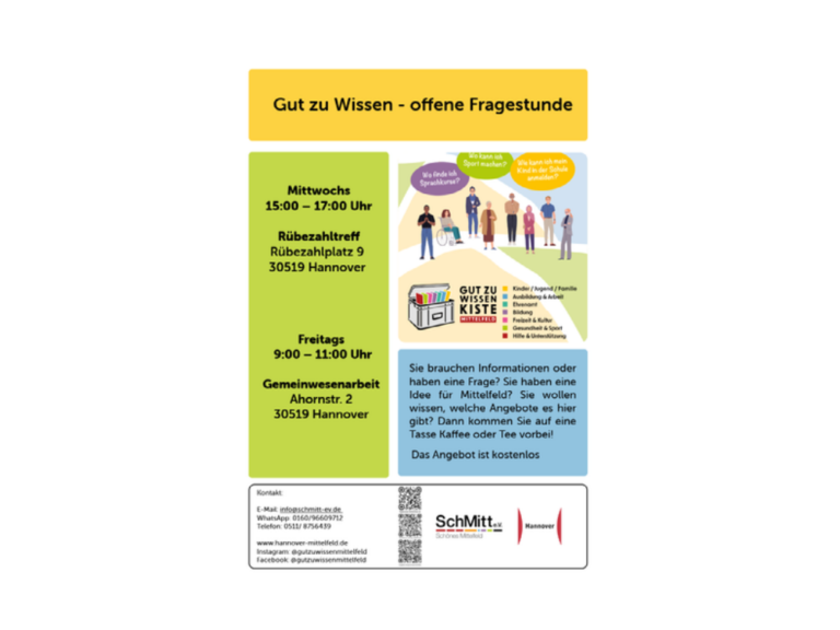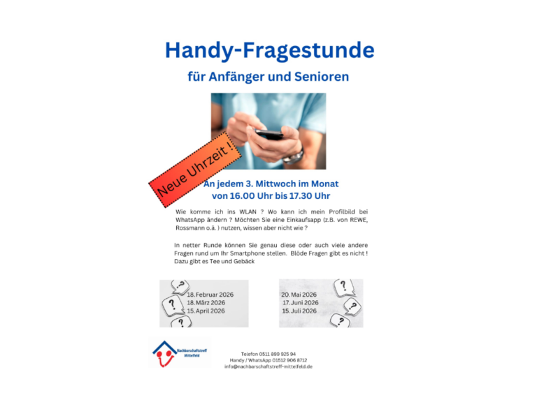 Sie brauchen Informationen oder haben eine Frage? Sie haben eine Idee für Mittelfeld? Sie wollen wissen, welche Angebote es hier gibt? Dann kommen Sie auf eine Tasse Kaffee oder Tee vorbei! Mittwochs 15:00 – 17:00 Uhr Rübezahltreff, Rübezahlplatz 9 30519 Hannover Freitags 9:00 – 11:00 Uhr Gemeinwesenarbeit Ahorn , ...Offener Treff (10-13 Jahre)16:00 - 19:00