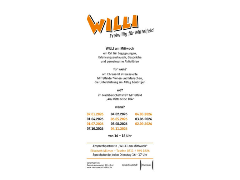 Wenn Sie WILLI kennenlernen möchten, kommen Sie gerne an jedem ersten Mittwoch im Monat zu unseren Treffen mit unseren ehrenamtlich Aktiven im Nachbarschaftstreff Mittelfeld vorbei. An jedem 1. Mittwoch im Monat kann man sich außerdem beim WILLI Café informieren und das WILLI-Team kennenlernen. Das WILLI Café ist e , ... - 2JuKiMob15:00 - 18:00