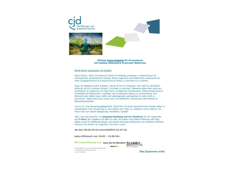 Du hast Lust auf Sport? Du hast eine Idee für ein kleines Projekt? Du Möchtest mit anderen Quatschen, Malen, Basteln, Kekse Backen, …? Es gibt bei uns keine feste Gruppe. Du kannst einfach vorbeikommen. Sag Deinen Eltern Bescheid, wohin Du gehst. Dies ist ein Angebot der Gnadenkirche und SchMitt e.V. mit freundlicher , ...Yoga für Erwachsene18:00 - 19:00