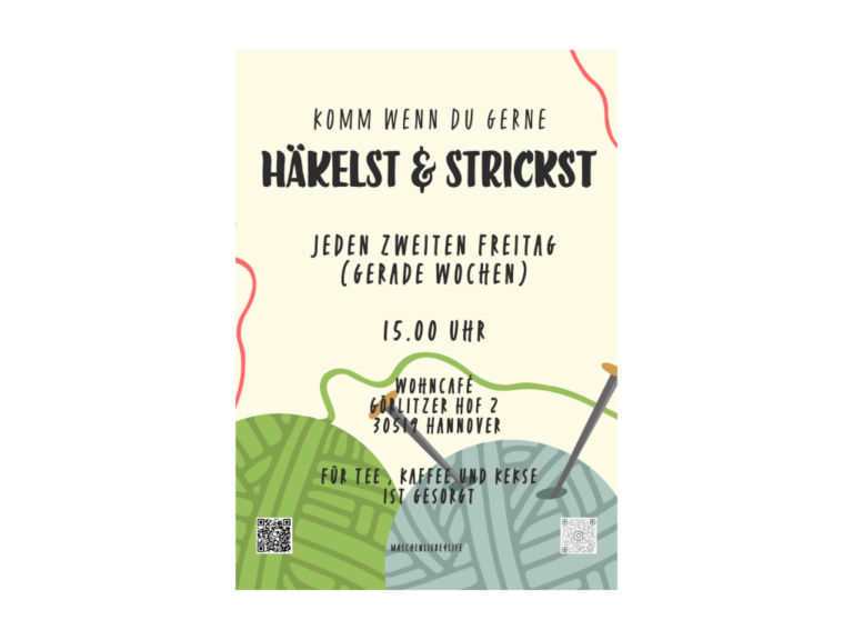 Jeden zweiten Freitag (gerade Wochen) treffen sich Begeisterte zum Häkeln und Stricken. Frau Kipp organisiert ehrenamtlich in Zusammenarbeit mit dem Wohncafé die Treffen. Jeder kann kommen, ob Anfänger oder Profi. Die Gruppe unterstützt sich gegenseitig mit Techniken und Ideen. Zusätzlich zu den Treffen vor Ort gibt e , ... - 4