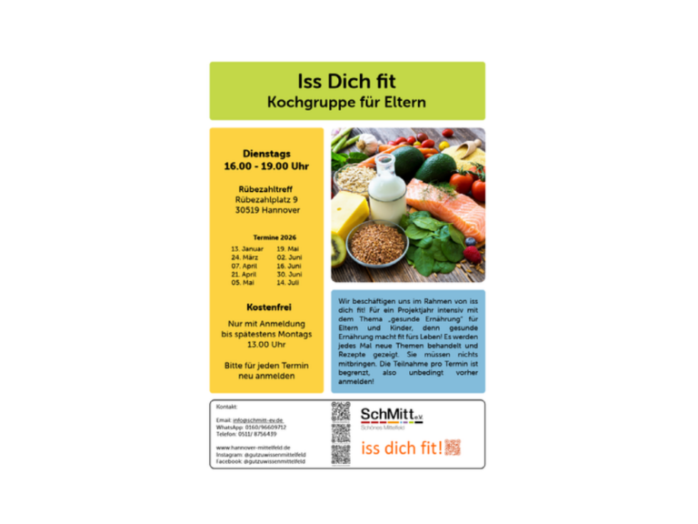 „Iss dich fit!“ Kochkurs für Eltern Wir beschäftigen uns im Rahmen von iss dich fit! Für ein Projektjahr intensiv mit dem Thema „gesunde Ernährung“ für Eltern und Kinder, denn gesunde Ernährung macht fit fürs Leben! Es werden jedes Mal neue Themen behandelt und Rezepte gezeigt. Sie müssen nichts mitbringen. Die Tei , ...Sprachcafé Mittelfeld16:30 - 18:00