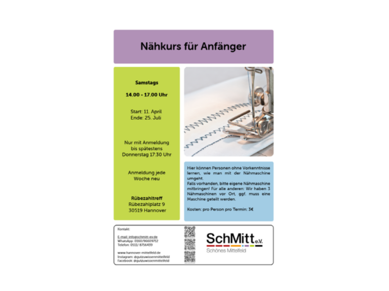 Spielerische Tanz- und Bewegungsübungen in einer kleinen Gruppe für Kinder von 5-13 Jahren. Die Kinder bekommen die Möglichkeit, die Welt des Tanzes kennenzulernen. Mit Choreografien aus Hip-Hop, Groove, Indischem Stil und Einflüssen aus trending Social Media Tänzen haben wir gemeinsam Freude und Spaß am Bewegen. N , ... - 2Nähkurs für Anfänger14:00 - 17:00