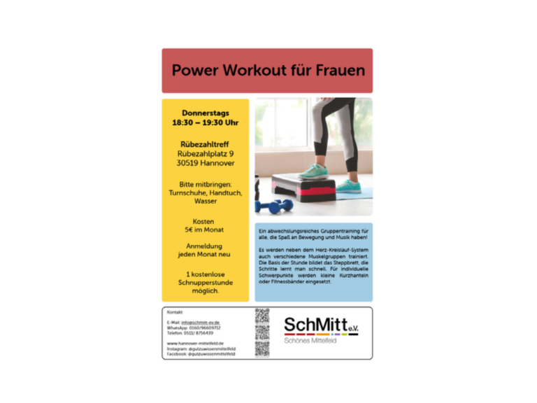 An jedem Donnerstag findet der Eltern Kind Nachmittag im Nachbarschaftstreff statt.Für Kinder von 0 – 6 Jahren und ihre Begleitung. Gemeinsam spielen und sich austauschen. Im Winter und bei schlechtem Wetter drinnen, wenn es das Wetter zu lässt auf dem Spielplatz hinter dem Nachbarschaftstreff. Für Tee und Ka , ...Power Workout für Frauen18:30 - 19:30
