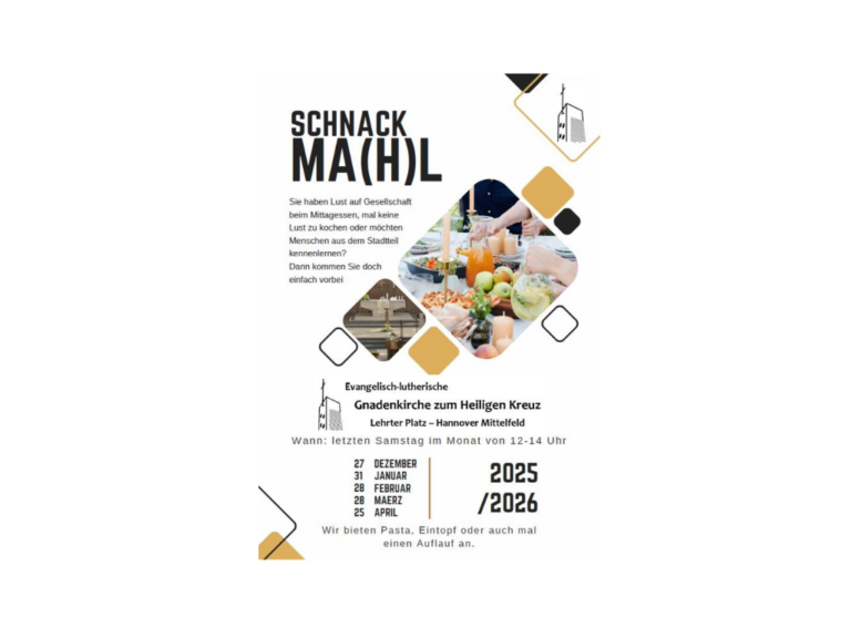 Sie haben Lust auf Gesellschaft beim Mittagessen? Kommen Sie vorbei, am letzten Samstag im Monat bietet die Gnadenkirche Pasta, Eintopf oder auch mal einen Auflauf. , ...Nähkurs für Anfänger14:00 - 17:00