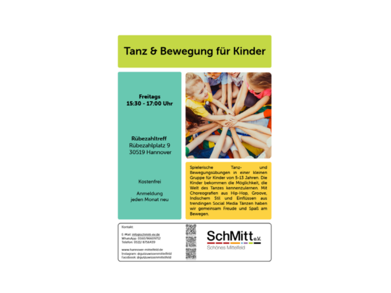 Sie brauchen Informationen oder haben eine Frage? Sie haben eine Idee für Mittelfeld? Sie wollen wissen, welche Angebote es hier gibt? Dann kommen Sie auf eine Tasse Kaffee oder Tee vorbei! Mittwochs 15:00 – 17:00 Uhr Rübezahltreff, Rübezahlplatz 9 30519 Hannover Freitags 9:00 – 11:00 Uhr Gemeinwesenarbeit Ahorn , ...Tanz und Bewegung für Kinder15:30 - 17:00