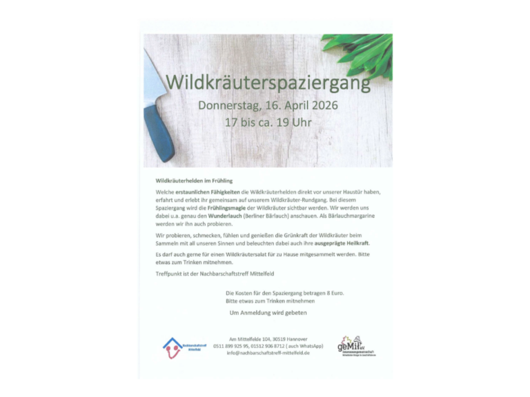 An jedem Donnerstag findet der Eltern Kind Nachmittag im Nachbarschaftstreff statt.Für Kinder von 0 – 6 Jahren und ihre Begleitung. Gemeinsam spielen und sich austauschen. Im Winter und bei schlechtem Wetter drinnen, wenn es das Wetter zu lässt auf dem Spielplatz hinter dem Nachbarschaftstreff. Für Tee und Ka , ...Walkräuterspaziergang17:00 - 19:00