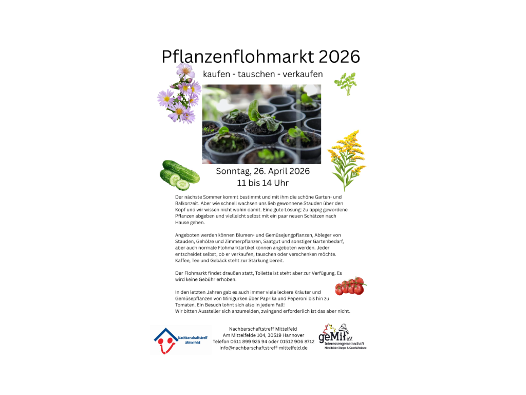 Kaffee, Tee und Gebäck steht zur Stärkung bereit. Der Flohmarkt findet draußen statt, Toilette steht aber zur Verfügung. Es wird keine Gebühr erhoben. In den letzten Jahren gab es auch immer viele leckere Kräuter und Gemüsepflanzen von Minigurken über Paprika und Peperoni bis hin zu Tomaten. Ein Besuch lohnt sich also in jedem Fall! Wir bitten Aussteller sich anzumelden, zwingend erforderlich ist das aber nicht.