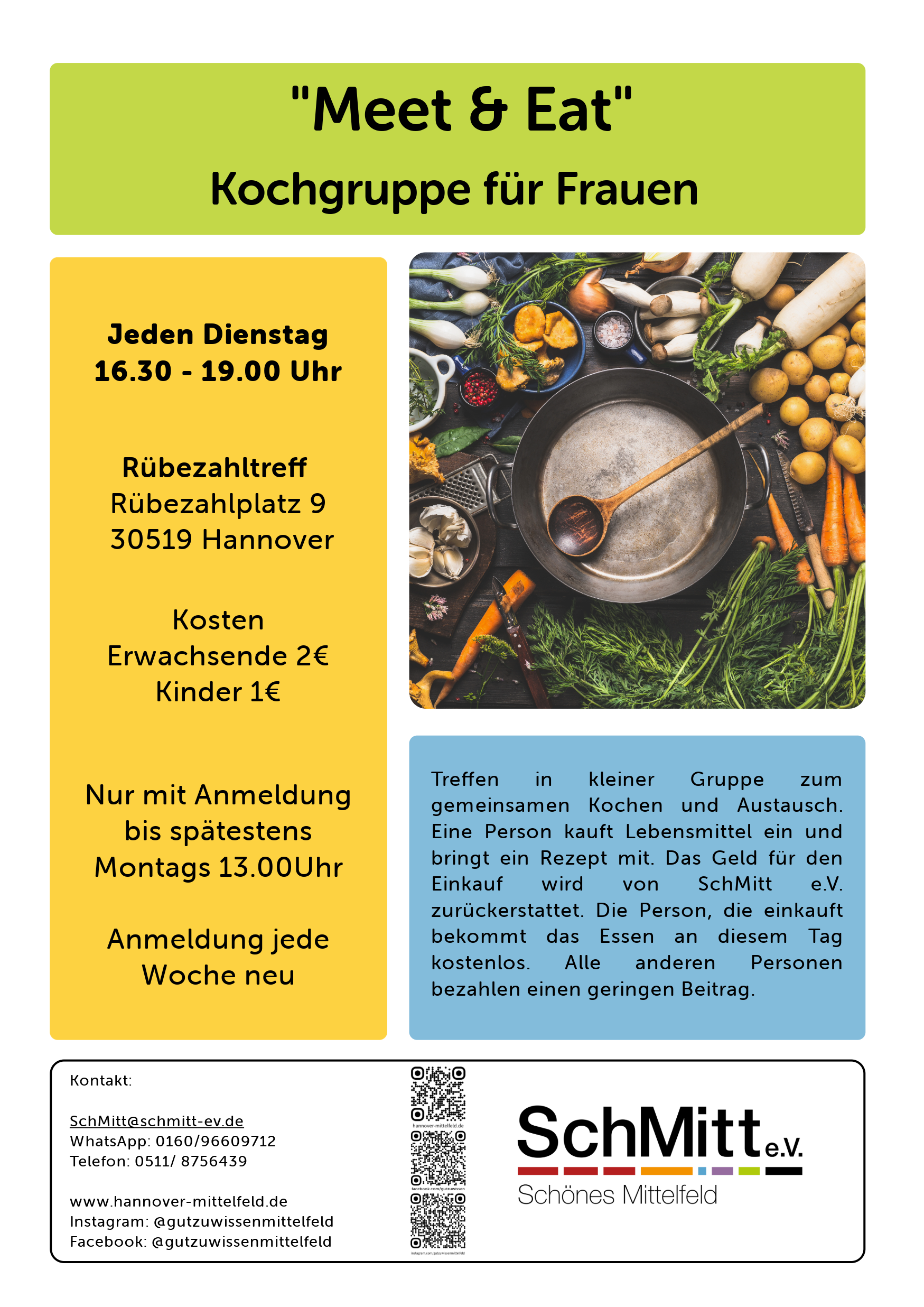 Treffen in kleiner Gruppe zum gemeinsamen Kochen und Austausch. Eine Person kauft Lebensmittel ein und bringt ein Rezept mit. Das Geld für den Einkauf wird von SchMitt e.V. zurückerstattet. Die Person, die einkauft bekommt das Essen an diesem Tag kostenlos. Alle anderen Personen bezahlen einen geringen Beitrag.