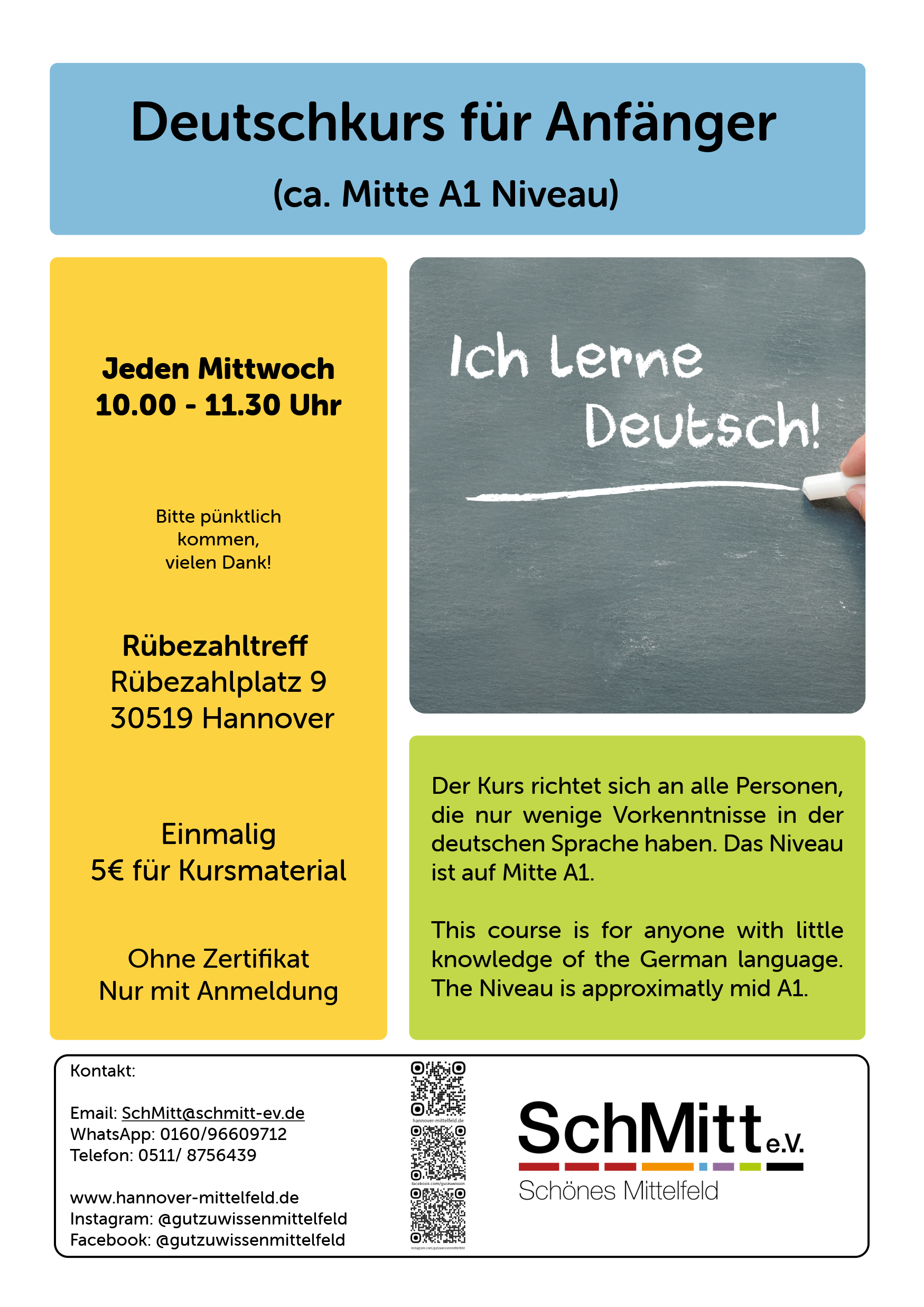 Der Kurs richtet sich an alle Personen, die sehr wenige Vorkenntnisse in der deutschen Sprache haben. Der Kurs ist ca. auf Niveau Mitte A1.